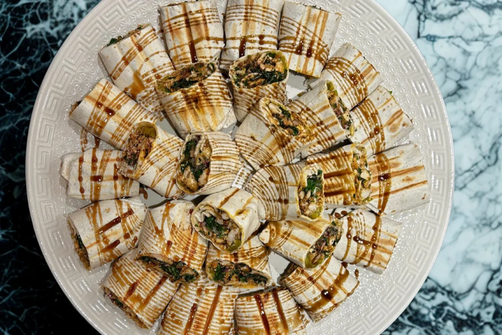 Shredded chicken and caramelised onions seasoned with sumac, wrapped in thin Syrian bread, and toasted till golden