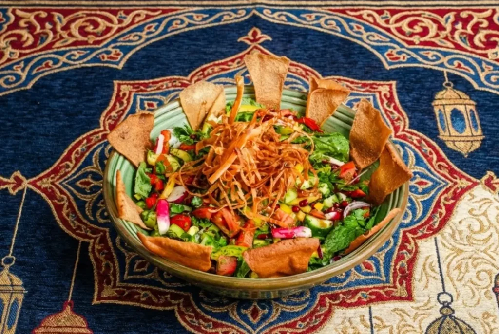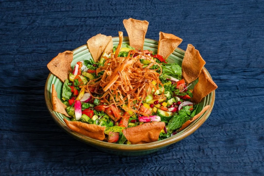 Garden-fresh vegetables and herbs, tossed in a lemon-pomegranate dressing, crowned with fried Syrian flatbread