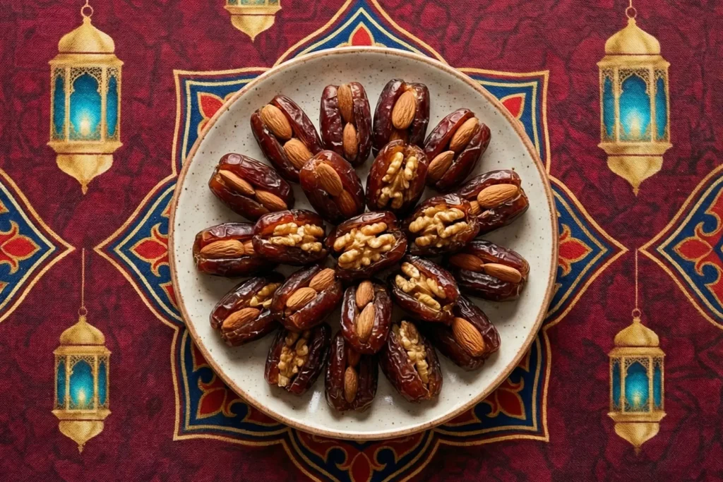 Premium Jordanian Medjool dates, offering a rich, balanced sweetness, carefully pitted and filled with almonds and walnuts