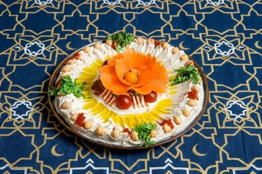 Chickpeas purée mixed with tahini, lemon juice, and garlic, topped with olive oil, and cherry tomatoes
