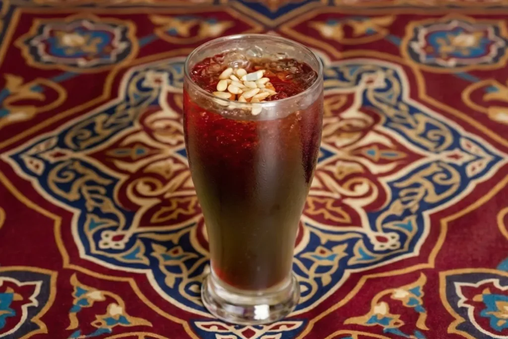 Jallab, a fragrant drink of date molasses and rosewater, served chilled and finished with toasted pine nuts