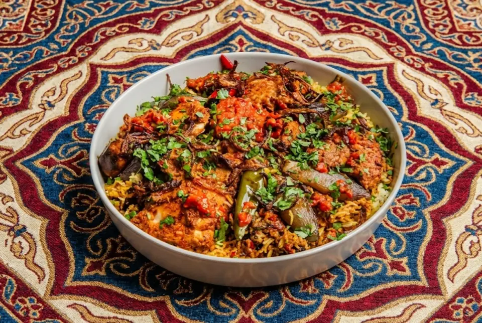 Basmati rice cooked with yogurt and peppers, infused with warm biryani spices and ginger, served with chicken