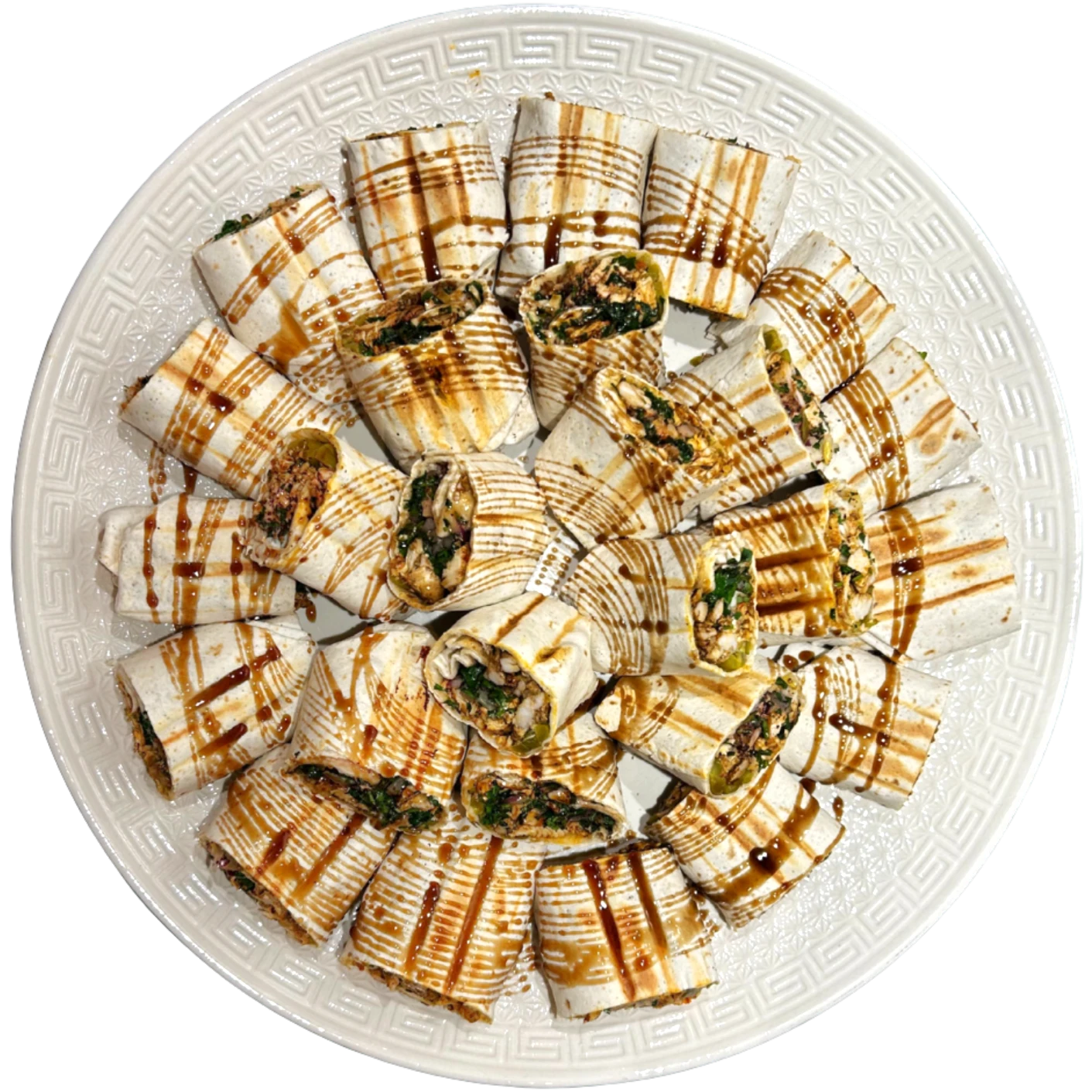 Shredded chicken and caramelised onions seasoned with sumac, wrapped in thin Syrian bread, and toasted till golden